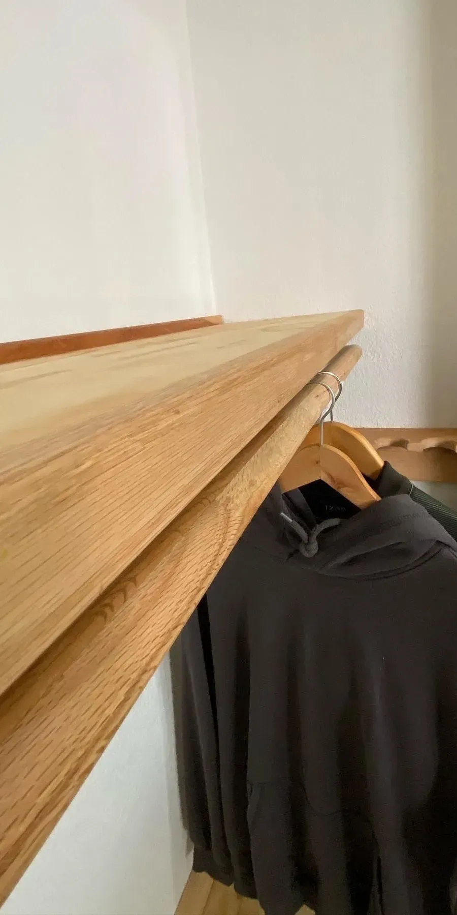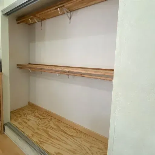The original closet was just a framed opening with no storage solutions in place. We installed new shelving and hanging rods made from solid wood, creating a durable and functional layout for clothing and accessories. The finished closet is clean, organized, and built to last, offering a practical upgrade with a polished look.